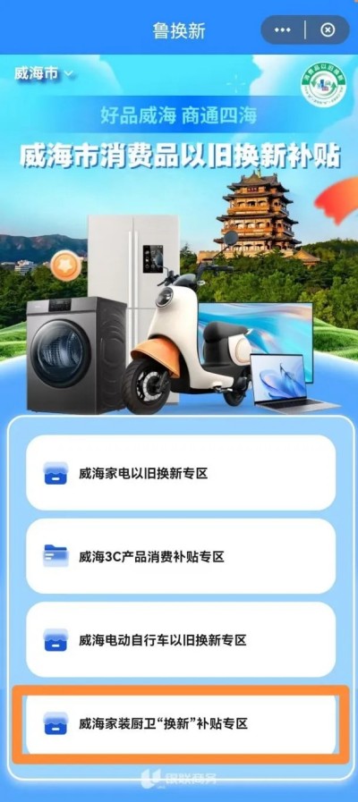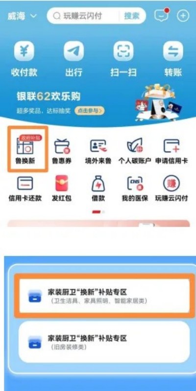 1.登錄平臺(tái)。打開(kāi)云閃付App升級(jí)至最新版本,打開(kāi)手機(jī)定位功能,并允許獲取位置信息。確認(rèn)首頁(yè)左上角的位置為“威海市”,在云閃付App搜索進(jìn)入“魯換新”小程序。點(diǎn)擊左上角“請(qǐng)選擇地市”,在下拉菜單中選擇“威海市”,點(diǎn)擊確認(rèn),進(jìn)入威海家裝廚衛(wèi)“煥新”補(bǔ)貼專區(qū)(衛(wèi)生潔具、家具照明、智能家居類)。
